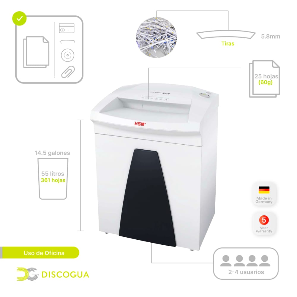 DESTRUCTORA DE DOCUMENTOS OFICINA MARCA HSM MODELO SECURIO B-22 5.8 MM CORTE EN TIRAS