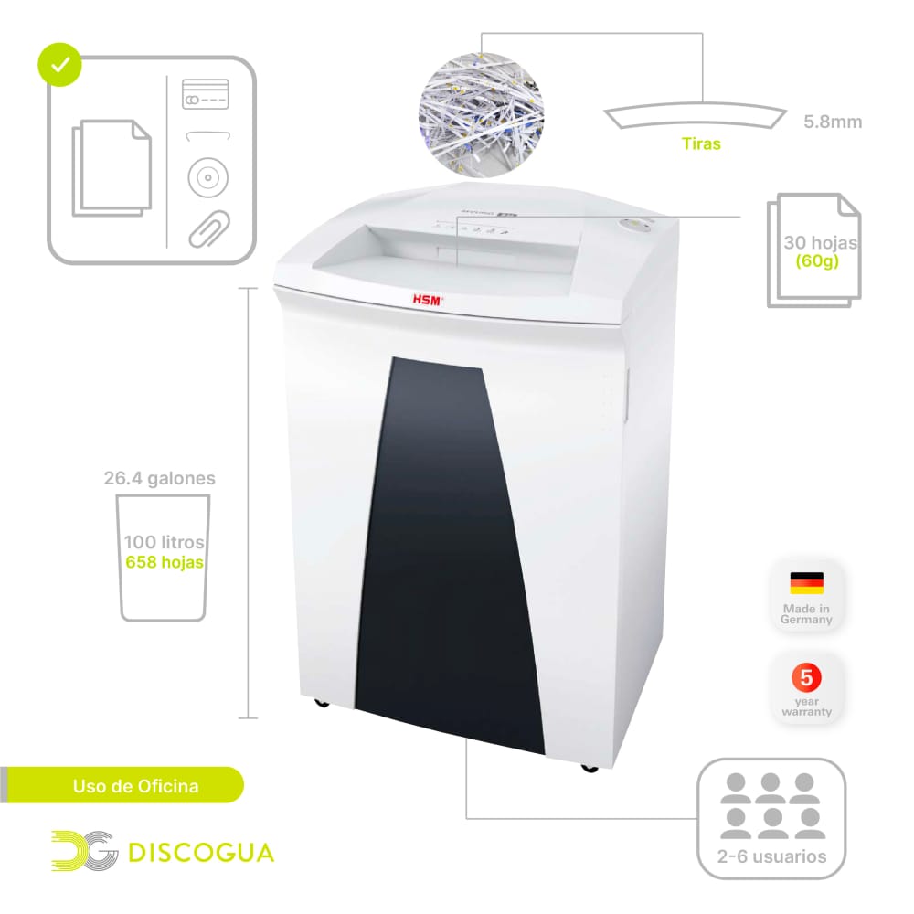DESTRUCTORA DE DOCUMENTOS OFICINA MARCA HSM MODELO SECURIO B-26 5.8 MM CORTE EN TIRAS