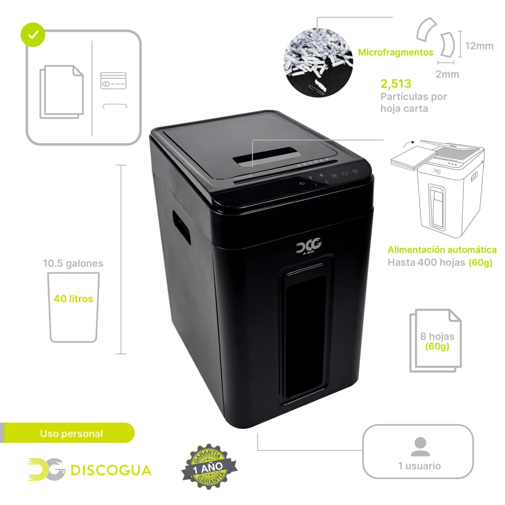 DESTRUCTORA DE DOCUMENTOS PERSONAL CON ALIMENTACION AUTOMATICA MARCA DCG MODELO A-400 2MM X 12MM CORTE EN MICROFRAGMENTOS