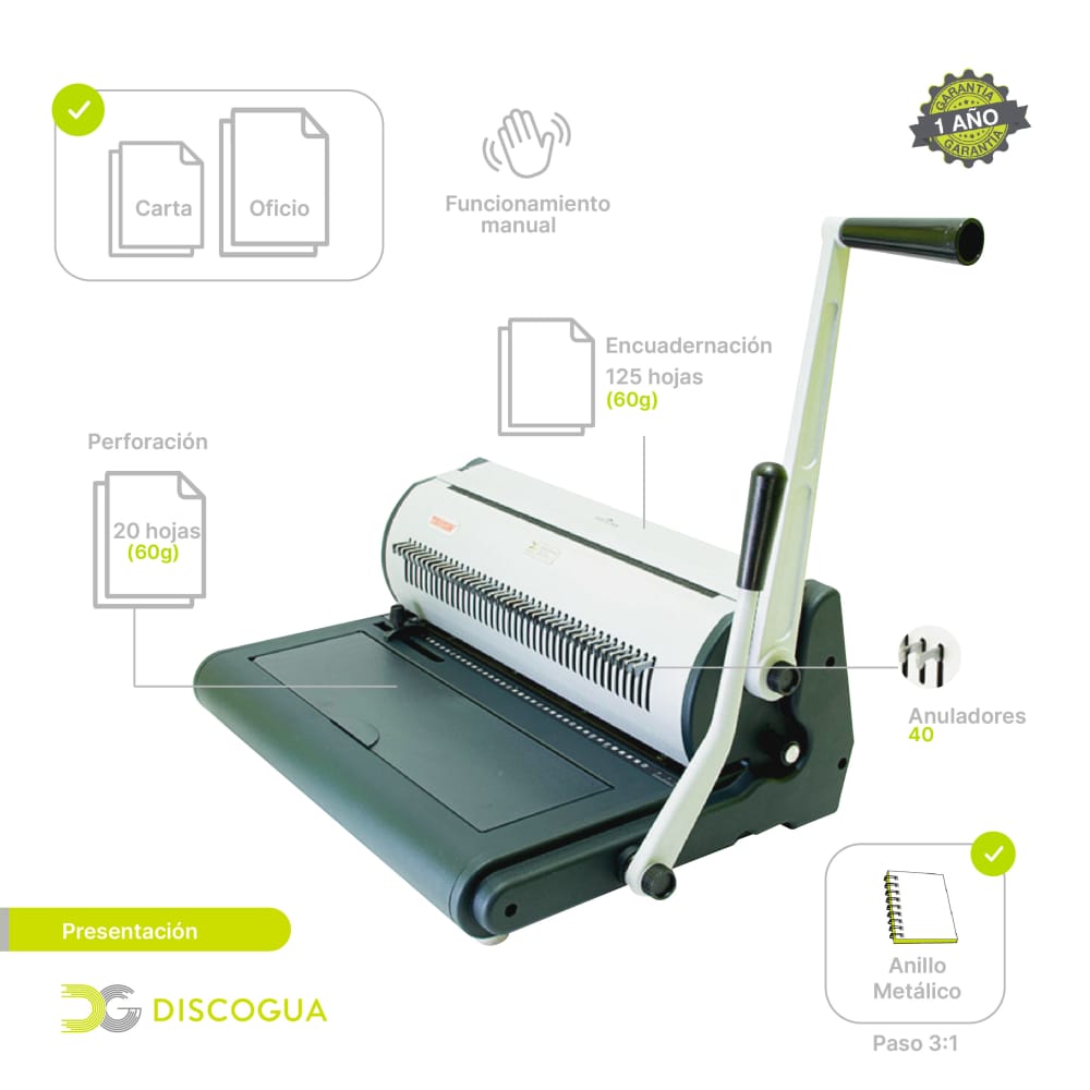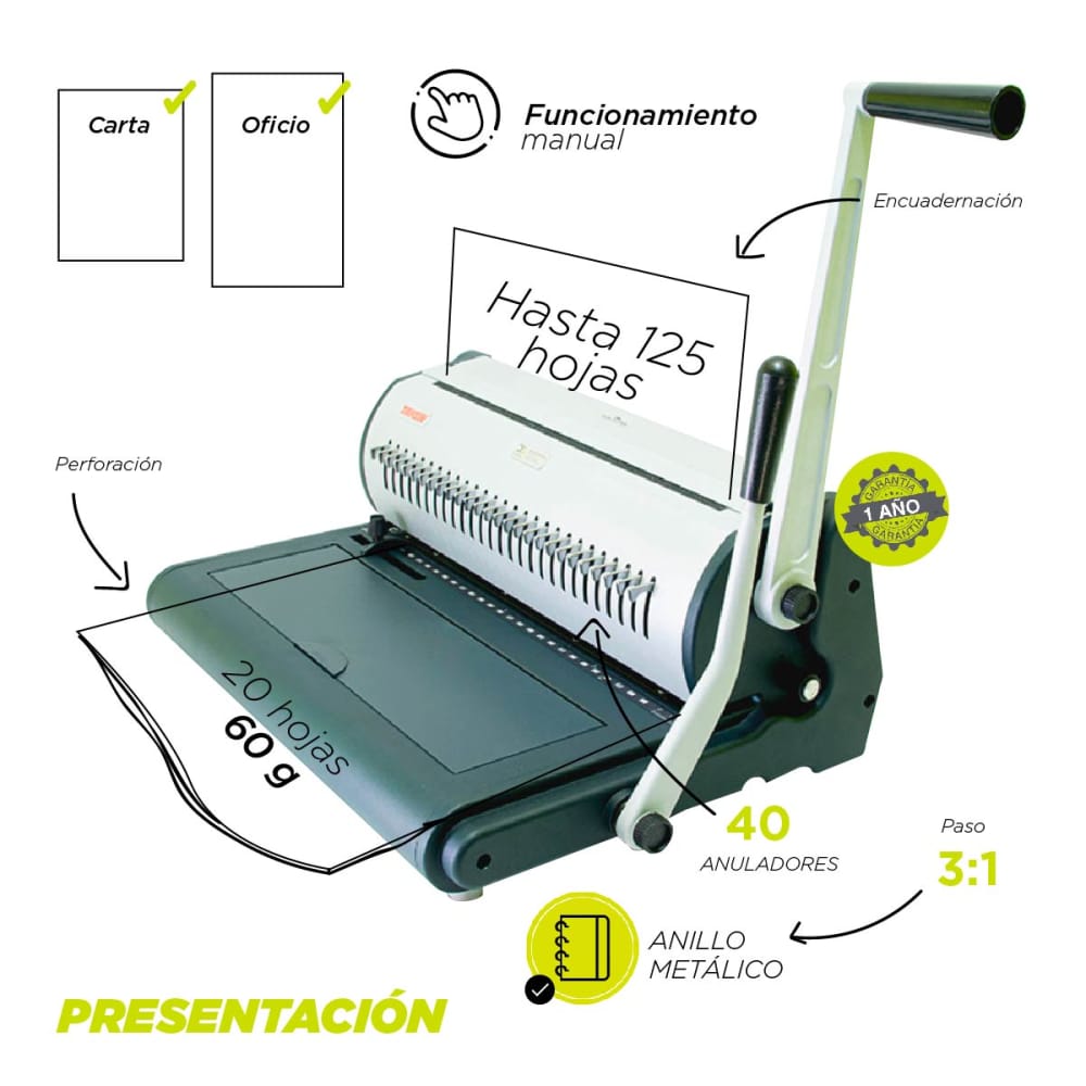 - Capacidad de perforación 20 hojas por operación (60 gramos)